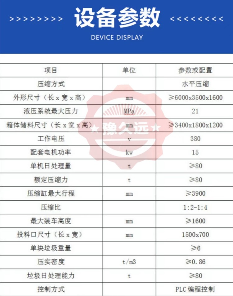 ◇全封閉水平壓縮:采用水平壓縮方式,垃圾壓縮密度≥0.86t/m3,垃圾壓縮后體積大大減小,從而大幅度提高轉(zhuǎn)運車輛裝載量