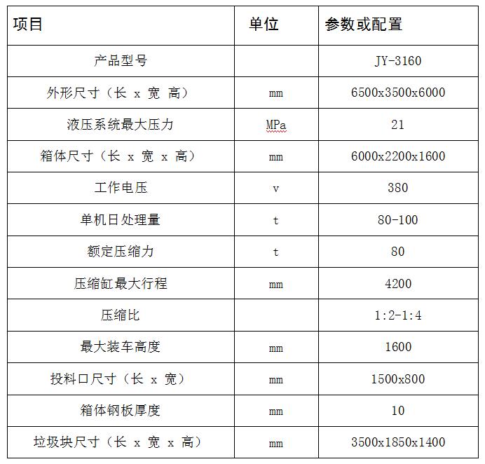 JY-3160 水平式四柱舉升垃圾壓縮設(shè)備主要用于對(duì)城鎮(zhèn)內(nèi)小區(qū)、居民點(diǎn)、學(xué)校、醫(yī)院、公園景區(qū)、廠礦和機(jī)關(guān)院校的生活垃圾以及固體廢棄物的收集、壓縮減容和封閉轉(zhuǎn)運(yùn)。